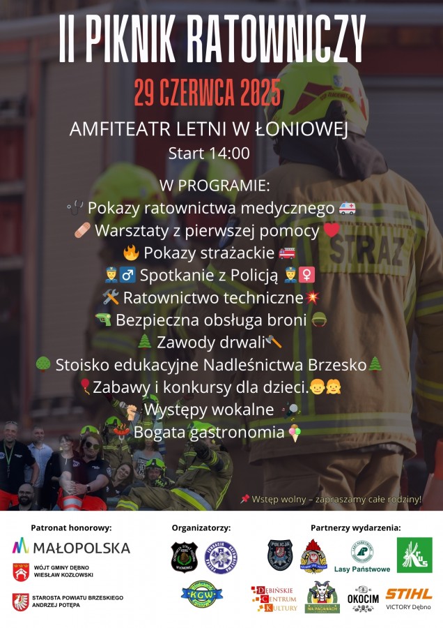 29 czerwca 2025 roku o godzinie 14:00 w Amfiteatrze Letnim w Łoniowej (gmina Dębno, GPS: 49.91184, 20.6975) odbędzie się II Piknik Ratowniczy – wyjątkowe wydarzenie dla całych rodzin, na które wstęp jest całkowicie wolny. W programie przewidziano liczne atrakcje, które łączą edukację z zabawą: pokazy ratownictwa medycznego, warsztaty z pierwszej pomocy, widowiskowe pokazy strażackie, spotkania z Policją, prezentacje ratownictwa technicznego oraz instruktaże bezpiecznej obsługi broni. Nie zabraknie emocjonujących zawodów drwali, edukacyjnego stoiska Nadleśnictwa Brzesko, zabaw i konkursów dla dzieci, występów wokalnych oraz bogatej oferty gastronomicznej.