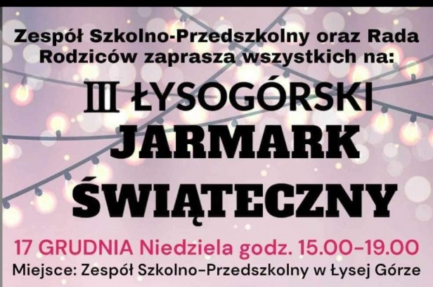 W najbliższą niedzielę tj. 17 grudnia o godzinie 15:00 w Zespole Szkolno-Przedszkolnym w Łysej Górze odbędzie się III Łysogórski Jarmark Świąteczny.