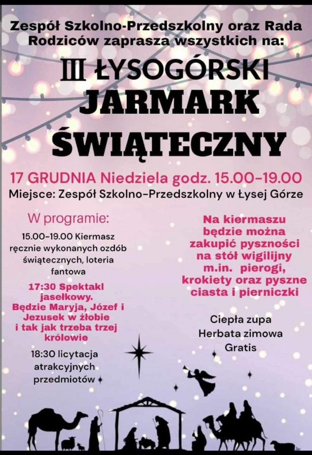 W najbliższą niedzielę tj. 17 grudnia o godzinie 15:00 w Zespole Szkolno-Przedszkolnym w Łysej Górze odbędzie się III Łysogórski Jarmark Świąteczny.