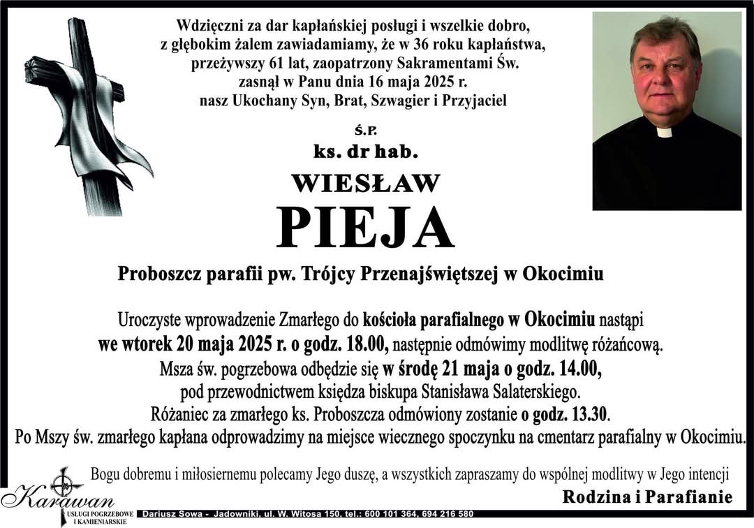 Msza święta pogrzebowa będzie celebrowana w środę 21 maja, o godz. 14.00 w kościele parafialnym w Okocimiu, po czym ciało zmarłego zostanie złożone na miejscowym cmentarzu.