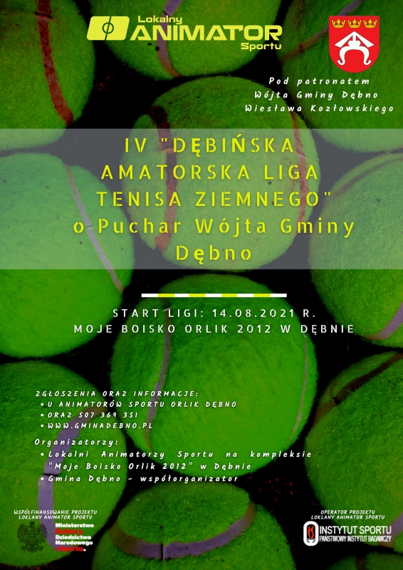 W sobotę, 14 sierpnia 2021 r. wystartuję IV Dębińska Amatorska Liga Tenisa Ziemnego o Puchar Wójta Gminy Dębno rozgrywana na wielofunkcyjnym boisku Orlik. Prawo udziału w lidze mają zawodnicy, którzy są mieszkańcami Gminy Dębno, którzy nie są zawodowymi graczami tenisa ziemnego.