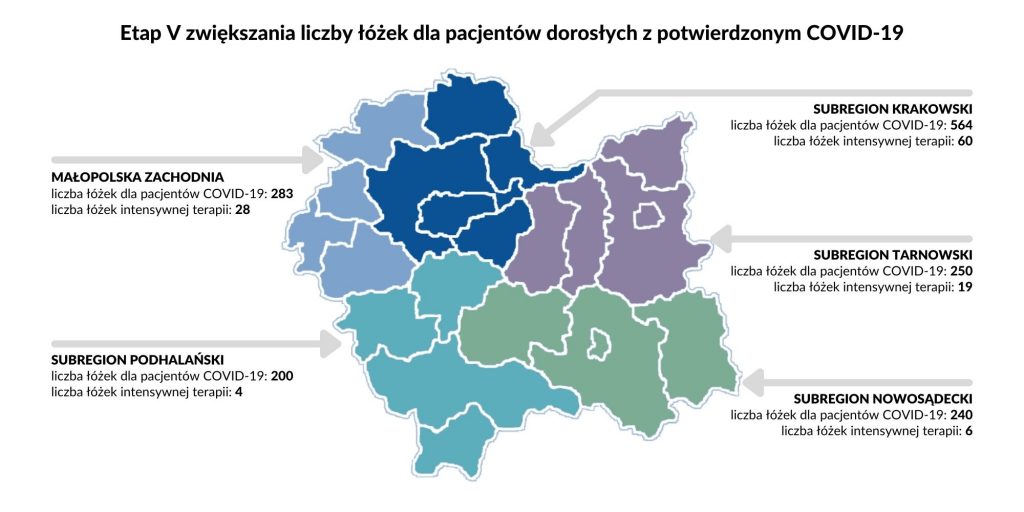 – Przygotowany plan opiera się na uzgodnionej ze szpitalami koncepcji elastycznego zabezpieczenia łóżek „covidowych” na wypadek zwiększonej liczby zakażeń koronawirusem w kolejnych sześciu etapach. Będą one uruchamiane przy ok. 75-80% zajętości łóżek dostępnych dla pacjentów z potwierdzonym COVID-19. Plan w zakresie etapowego zwiększania liczby łóżek w ujęciu subregionalnym będzie stanowił podstawę do wydawania decyzji i poleceń dotyczących zwiększania bazy łóżkowej dla pacjentów w województwie małopolskim – tłumaczy wojewoda Łukasz Kmita.