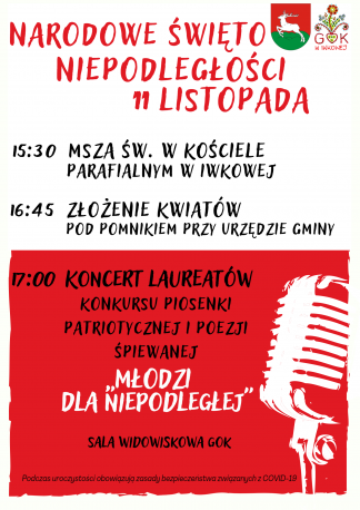 - 17:00 Koncert Laureatów Konkursu Piosenki Patriotycznej i Poezji Śpiewanej „Młodzi dla Niepodległej” w sali widowiskowej Gminnego Ośrodka Kultury w Iwkowej