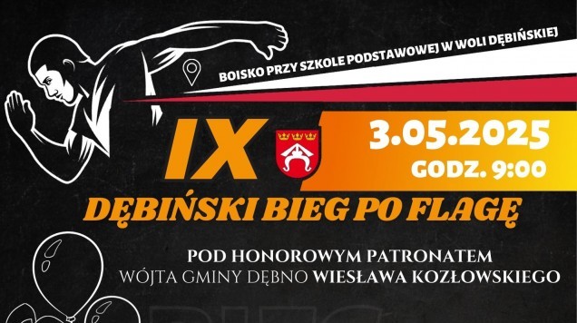 Już 3 maja 2025 roku o godzinie 9:00 na boisku przy Szkole Podstawowej w Woli Dębińskiej odbędzie się IX edycja Dębińskiego Biegu po Flagę. Wydarzenie, które już na stałe wpisało się w kalendarz lokalnych uroczystości patriotyczno-sportowych, odbędzie się pod honorowym patronatem Wójta Gminy Dębno – Wiesława Kozłowskiego.