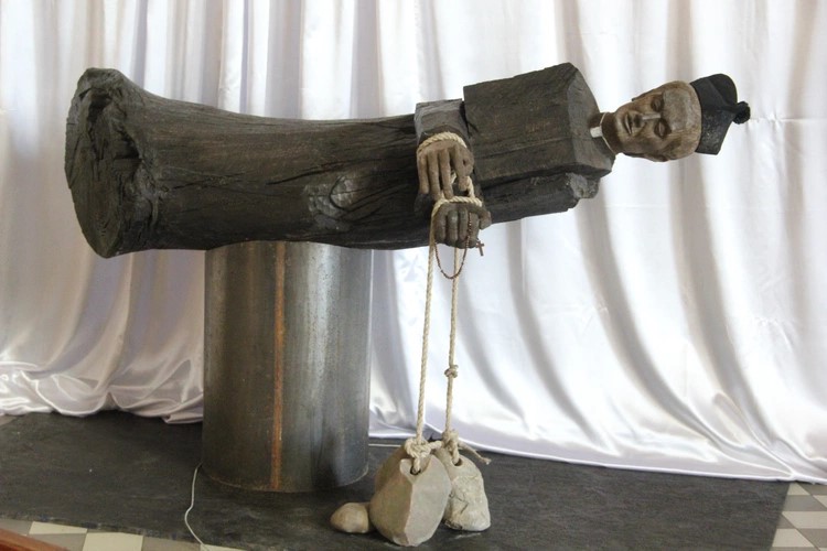 Wyrzeźbiona postać ks. Jerzego Popiełuszki jest przewrócona. Ręce ma skrępowane sznurami, na końcach których przywiązane są ciężkie kamienie. Choć rzeźba przedstawia moment męczeńskiej śmierci błogosławionego kapłana, jego twarz jest spokojna.