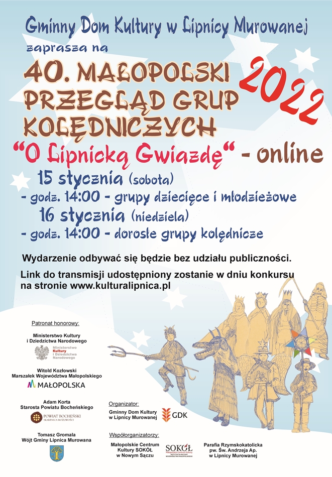 Rok 2022 jest rokiem wyjątkowym, bowiem właśnie teraz przypada jubileuszowa czterdziesta edycja Małopolskiego Przeglądu Grup Kolędniczych o „Lipnicką Gwiazdę”. Ze względu na wprowadzone obostrzenia wydarzenie będzie odbywało się w formie on-line, bez udziału publiczności. Pomimo braku widzów cieszy jednak fakt, że w Gminnym Domu Kultury pojawią się grupy kolędnicze, by kultywować tą piękną, prastarą tradycję.