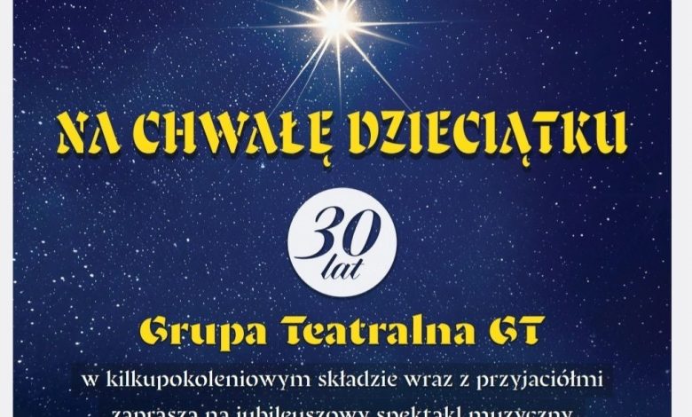 Grupa Teatralna GT działająca przy Parafii Miłosierdzia Bożego w Brzesko świętująca 30-lecie swej działalności w kilkupokoleniowym składzie wraz z przyjaciółmi zaprasza na jubileuszowy spektakl muzyczny pt. „Na chwałę Dzieciątku”. Spektakl zostanie wystawiony w niedzielę 19 stycznia 2025 r. o godz. 16:30 i 18.30 w sali teatralnej przy Kościele Miłosierdzia Bożego w Brzesku.