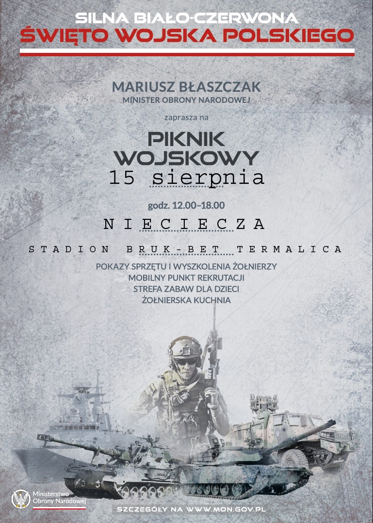 Szef Wojskowego Centrum Rekrutacji w Tarnowie zaprasza na piknik wojskowy pn. „Silna Biało-Czerwona”, którego organizatorem jest Ministerstwo Obrony Narodowej. Impreza odbędzie się 15 sierpnia 2023 r. na terenie stadionu sportowego BRUK-BET Termalica w Niecieczy w godzinach od 12.00 do 18.00.