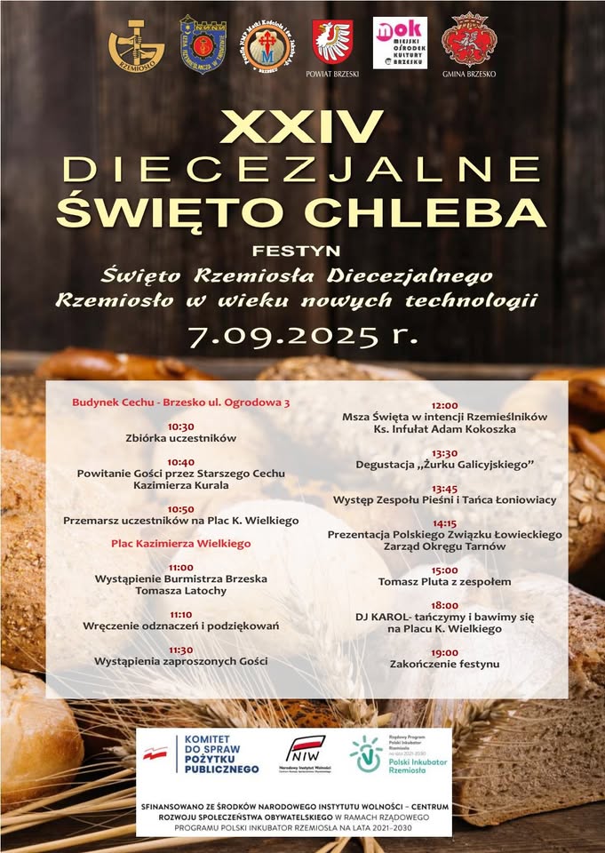 W niedzielę 7 września 2025 r. na Placu Kazimierza Wielkiego w Brzesku odbędzie się XXIV Diecezjalne Święto Chleba połączonego z Festynem „Święto Rzemiosła Diecezjalnego-Rzemiosło w wieku nowych technologii”.