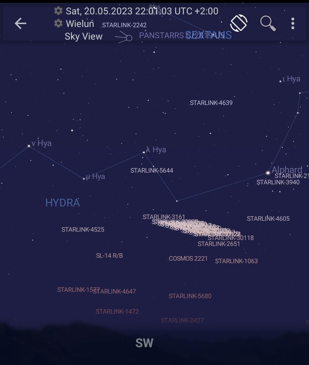W najbliższych dniach będziemy mieć kolejną szansę na zobaczenie przelotu satelitów Starlink. Satelity z najnowszej serii będzie można zobaczyć m.in. 21 maja 2023 r. około godziny 22.00. Będzie to niski przelot nad zachodnim i południowo zachodnim horyzontem.