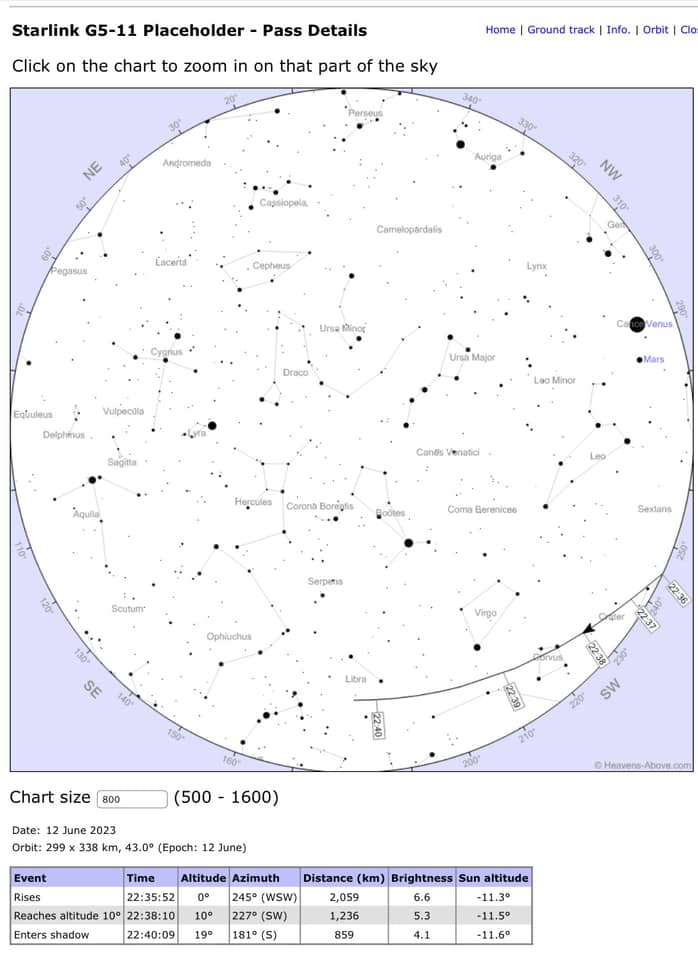 W najbliższych dniach będziemy mieć kolejną szansę na obserwację przelotu satelitów Starlink. Satelity z najnowszej serii będzie można zobaczyć od 12 czerwca 2023 r. Dosyć nisko na południowo zachodnim niebie pojawi się aż 51 satelitów!