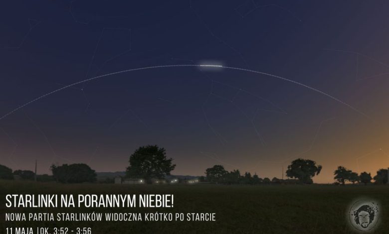 W najbliższych dniach będziemy mieć kolejną szansę na zobaczenie spektakularnego przelotu satelitów Starlink. Satelity z najnowszej serii będzie można zobaczyć 11 maja 2023 r. nad ranem około godz. 3.51. na pewno nie jest dobra godzina do obserwacji Starlinków dla tych którzy lubią pospać.