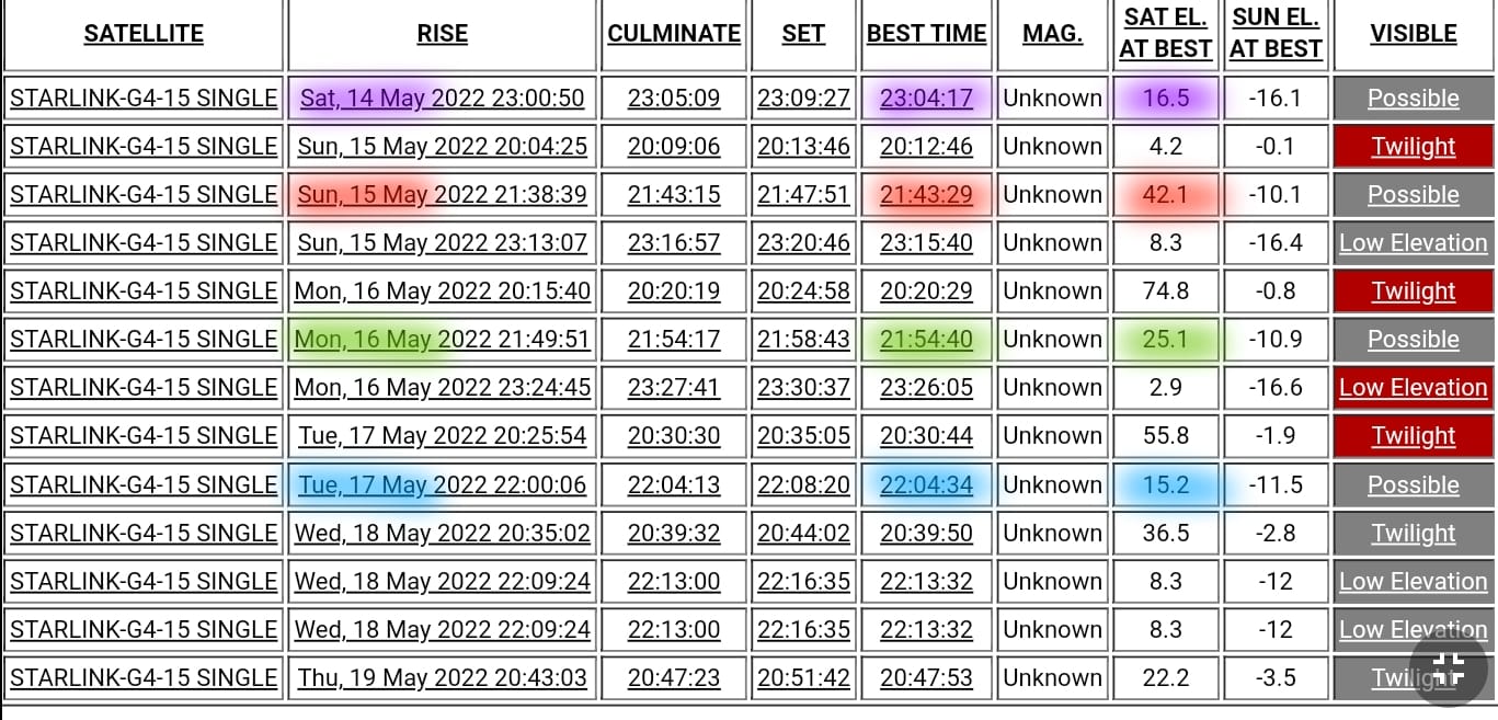 Tabelka z przelotami. Fioletowy to przelot Falcona. Pozostałe kolory to przeloty Starlinków na kolejne wieczory. Data, godzina najlepszej widoczności oraz wysokość nad horyzontem. Tabelka dla Białegostoku.
