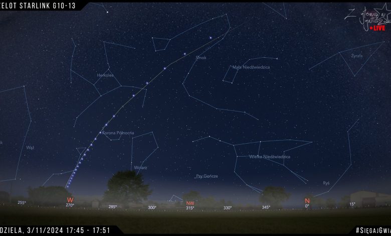 Dziś wieczorem (03/11/2024) przelot kosmicznego pociągu będziemy obserwować pomiędzy 17:46 a 17:51.