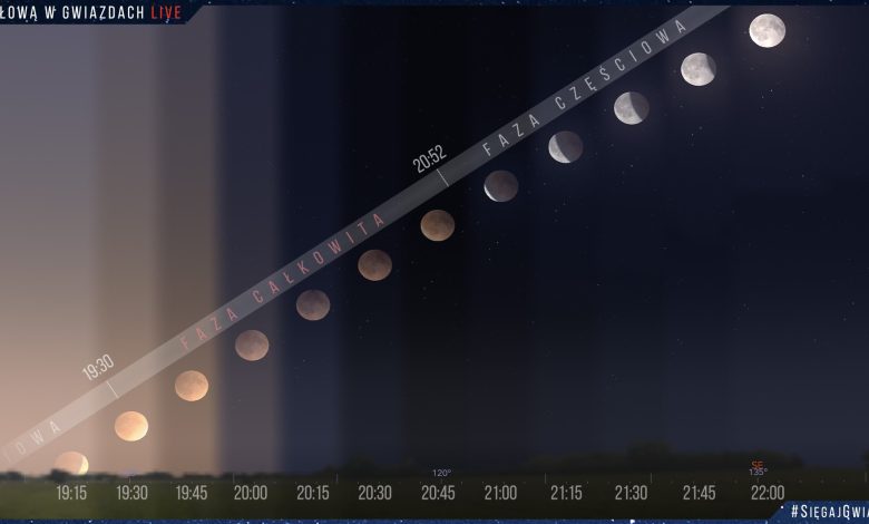 – Ale im dalej w noc, tym ciemniejsze będzie niebo, a około 20:45 – tuż przed końcem fazy całkowitej – stanie się ono naprawdę ciemne! To będzie piękny moment: Księżyc w krwawym cieniu Ziemi i setki gwiazd widocznych wokół niego. Zdjęcia wykonane właśnie wtedy mogą być absolutnie niezwykłe – szczególnie, jeśli wybierzecie się daleko od świateł miasta – podkreśla Karol Wójcicki z kanału Z głową w gwiazdach.
