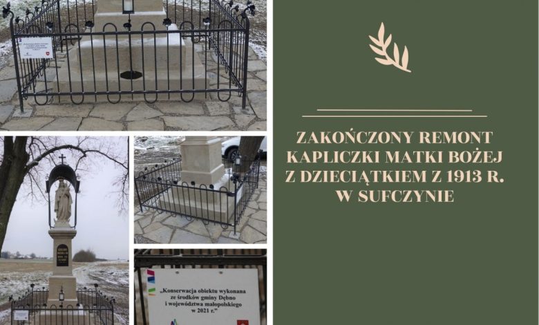 W środę 8 grudnia odbył się odbiór wyremontowanej kapliczki Matki Bożej z Dzieciątkiem z 1913 r. w Sufczynie. W ramach zadania odnowiono rzeźbę kamienną polichromowaną z piaskowca, wykonano konserwację płaskorzeźby, detalu architektonicznego prostego polichromowanego, metalowych elementów oraz złocenie. Ponadto wykonano nowe posadowienie kapliczki i ogrodzenia, a także zaaranżowano nową nawierzchnię.