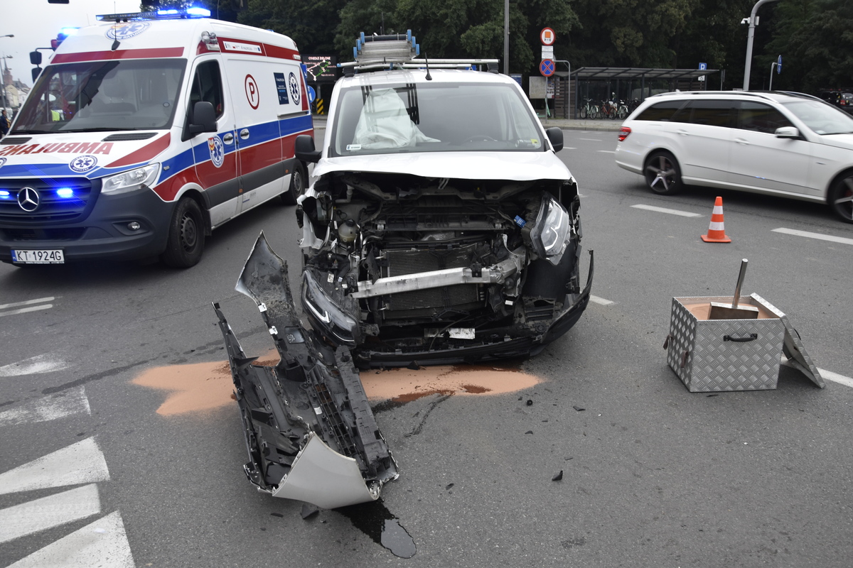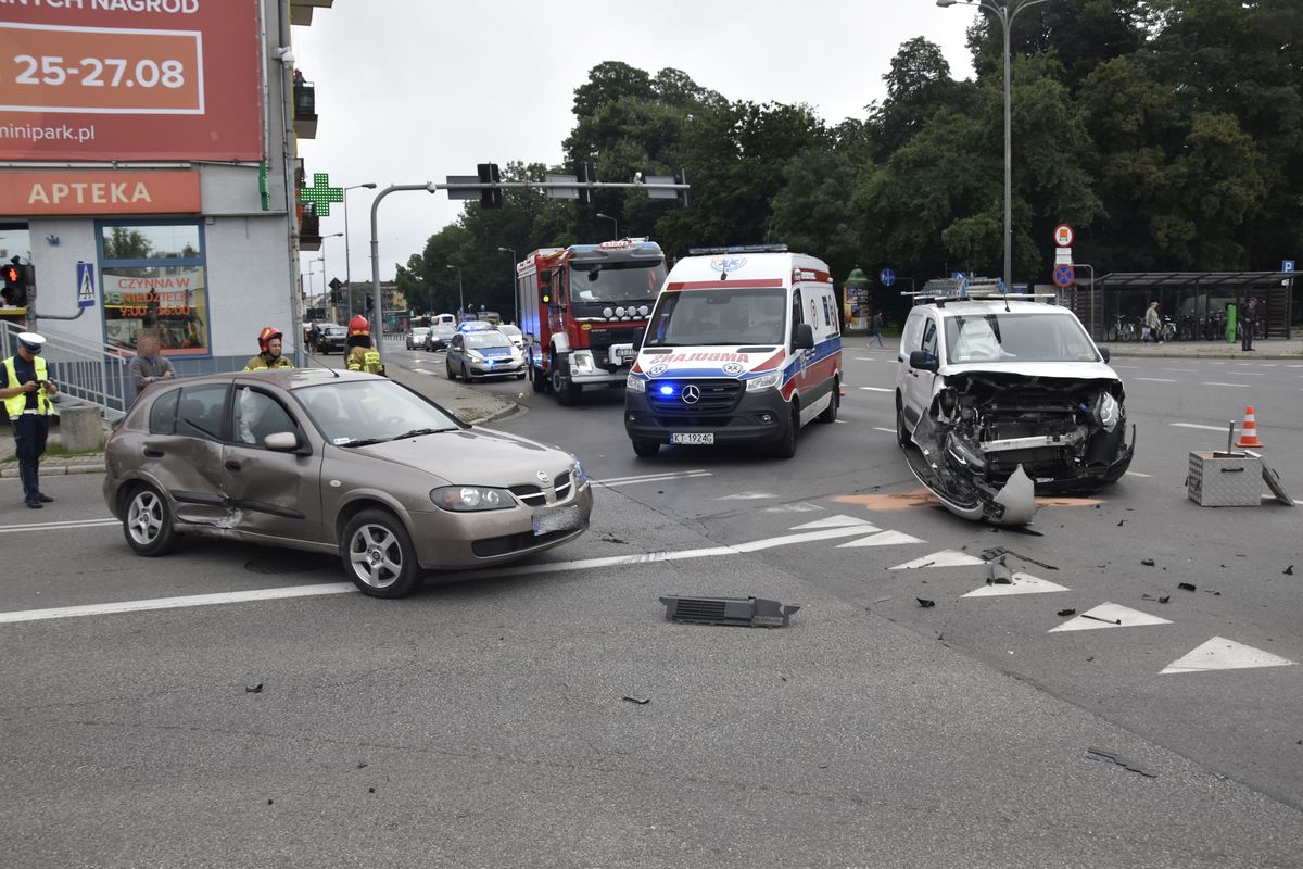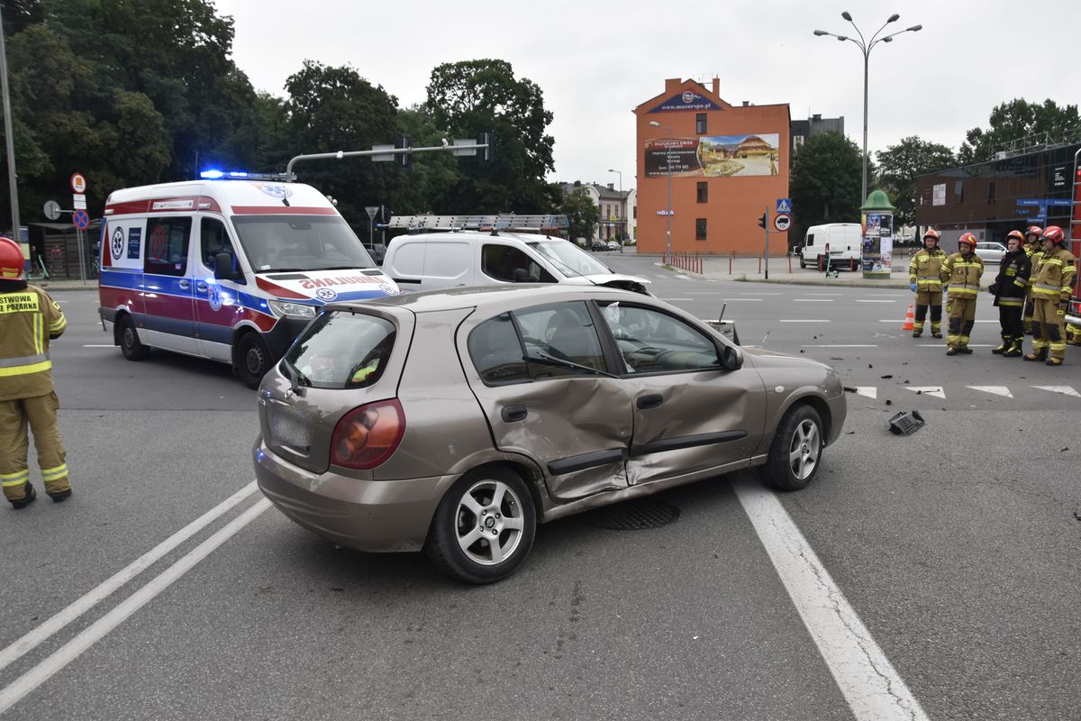 W centralnej części skrzyżowania został uderzony w bok przez jadącego ul. Krakowską na wprost kierującego pojazdem m-ki Toyota.