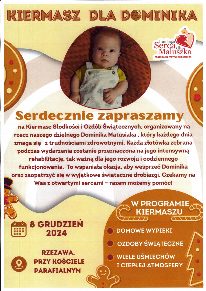 Serdecznie zachęcamy Państwa do udziału w akcji charytatywnej na rzecz rocznego Dominika Matusiaka, który przez chorobę wymaga regularnej rehabilitacji oraz stałej opieki wielu lekarzy. Wesprzeć chłopca będzie można podczas Kiermaszu Słodkości i Ozdób Świątecznych, który odbędzie się 8 grudnia na placu przy kościele w Rzezawie.