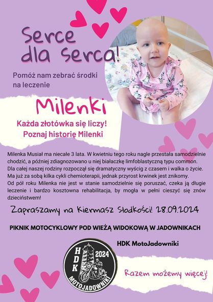 Milenka Musiał ma niecałe 3 lata. W kwietniu tego roku nagle przestała samodzielnie chodzić, a później zdiagnozowano u niej białaczkę limfoblastyczną typu common. Dla całej naszej rodziny rozpoczął się dramatyczny wyścig z czasem i walka o życie. Ma już za sobą kilka cykli chemioterapii, jednak przyrost krwinek jest znikomy. Od pół roku Milenka nie jest w stanie samodzielnie się poruszać, czeka ją długie leczenie i bardzo kosztowna rehabilitacja, by mogła w pełni cieszyć się znów dzieciństwem!