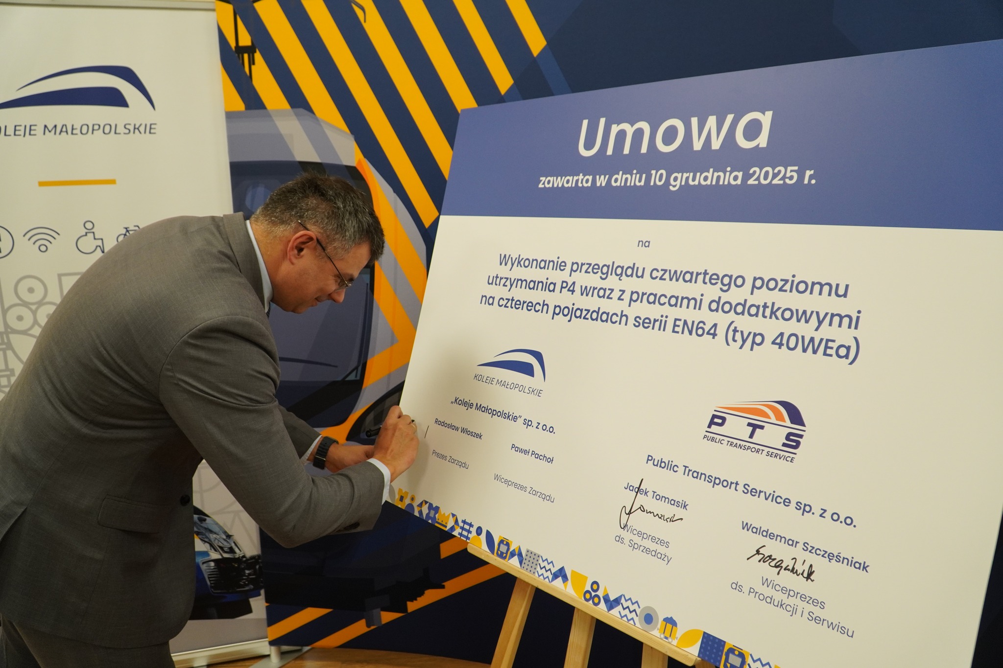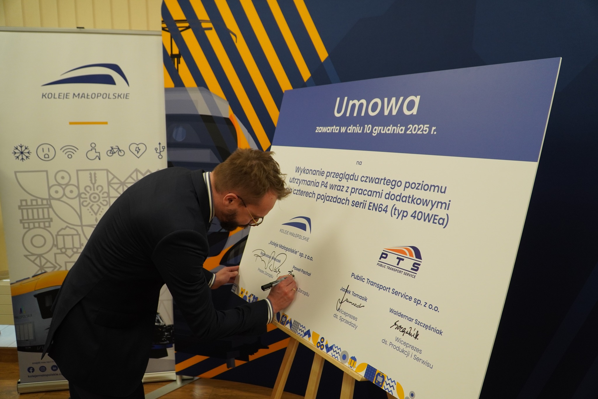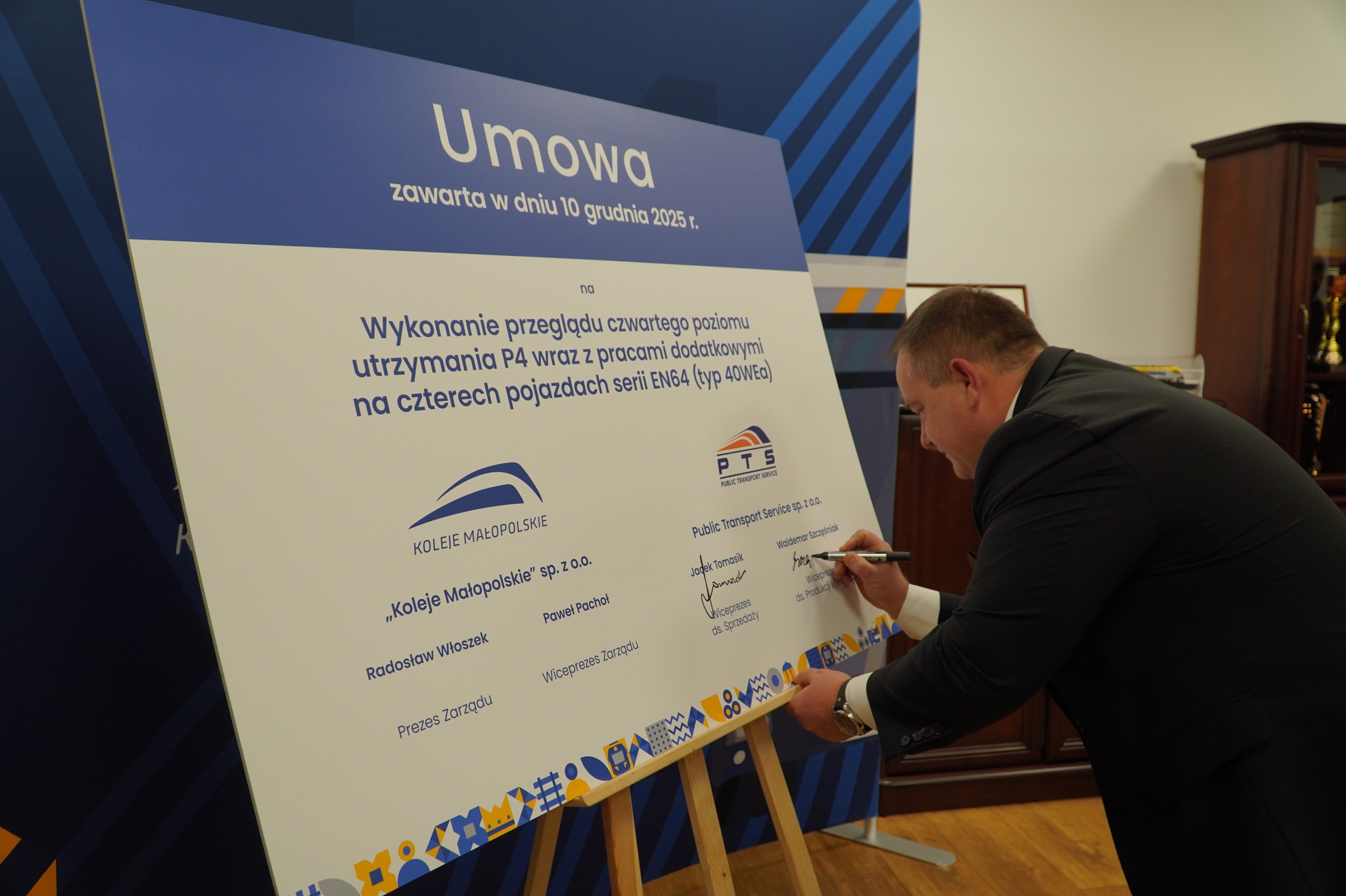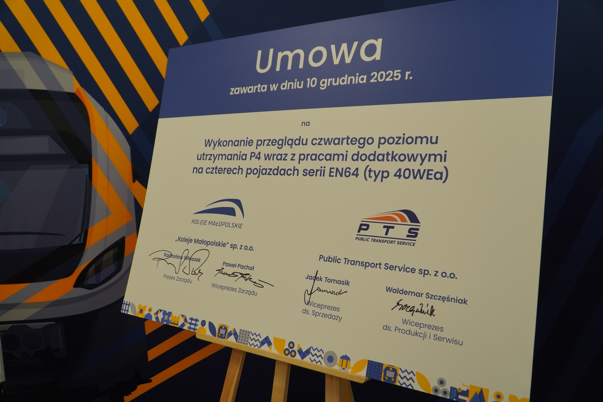 Spółka „Koleje Małopolskie” podpisała dziś umowę z firmą Public Transport Service sp. z o.o. na realizację przeglądów czwartego poziomu utrzymania (P4) elektrycznych zespołów trakcyjnych. Tym samym spółka oficjalnie rozpoczyna proces przeglądów wyższego rzędu, niezbędny dla dalszego, bezpiecznego i niezawodnego funkcjonowania eksploatowanego taboru.