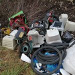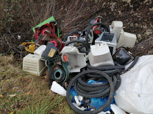 Na zdjeciu widzimy o dziwo posegregowane części kosiarek do trawy, monitorów komputerowych i telewizorów, a także opon rowerowych i samochodowych. Sprzęt został pozbawiony wszelkich elementów metalowych i elektronicznych.