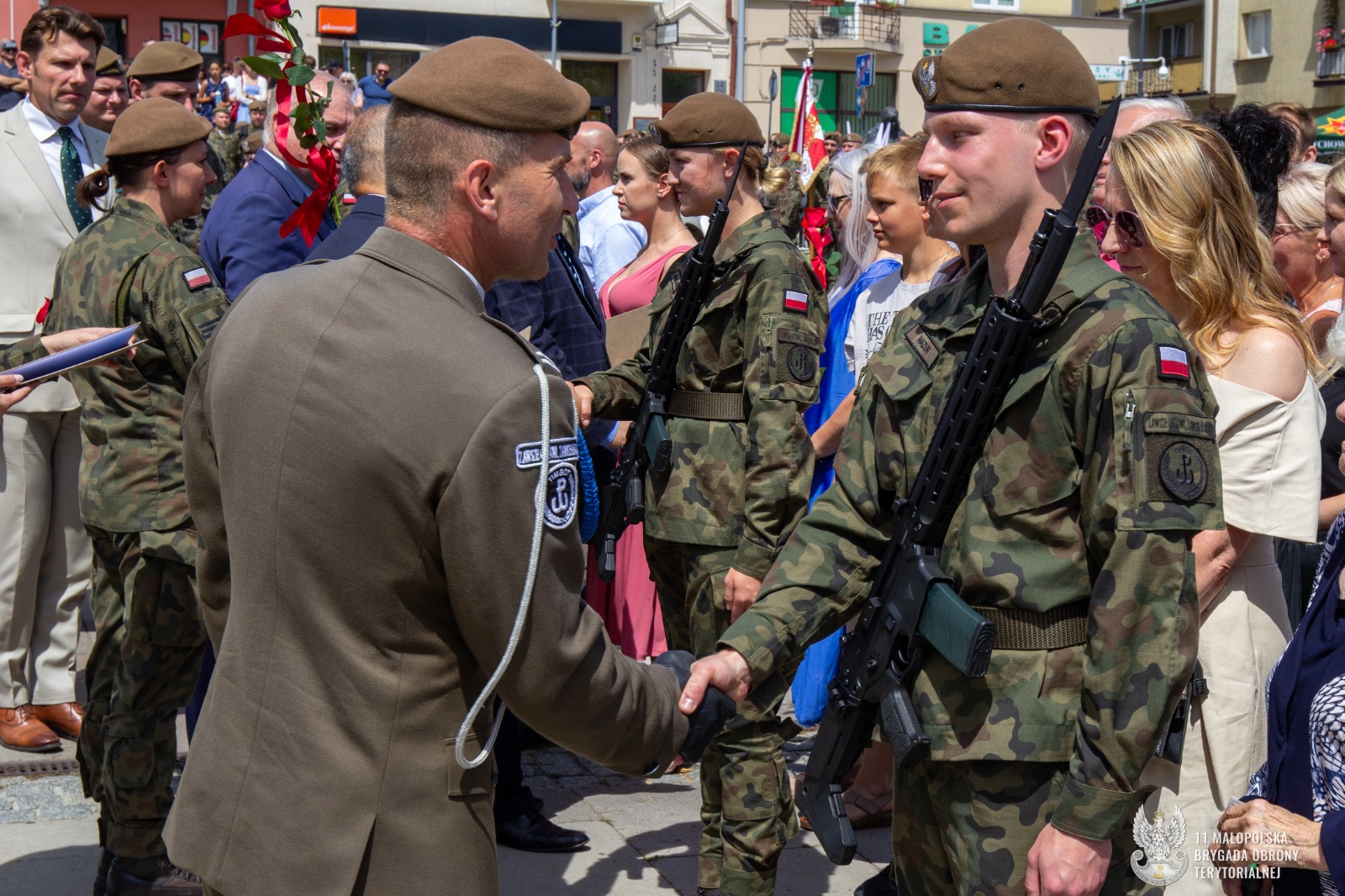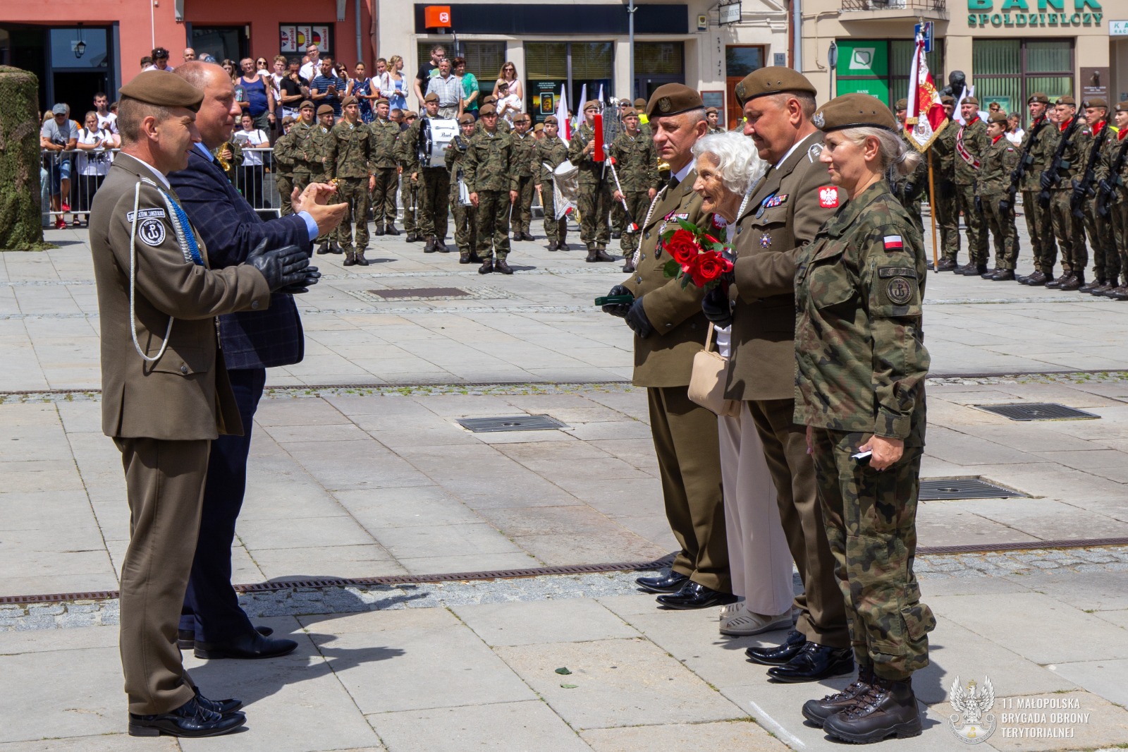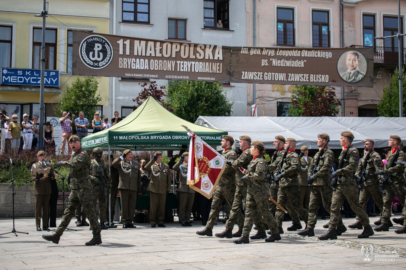 Uroczyste ślubowanie Terytorialsi złożyli w obecności dowódcy jednostki, płka Marcina Siudzińskiego. – Jesteśmy w różnym wieku, mamy różne historie i rozmaite pasje. Na co dzień wykonujemy różne zawody, ale łączy nas jedno – wiara w te same wartości. Jeśli chcemy żyć w bezpiecznym kraju, sami musimy o to bezpieczeństwo zadbać. Najprościej właśnie zakładając mundur – mówił do żołnierzy podczas przysięgi dowódca 11 Małopolskiej Brygady Obrony Terytorialnej. Gościem honorowym uroczystości w Gorlicach była major Hanna Zawistowska – Nowińska ps. Hanna Zerwicz, żołnierz Armii Krajowej, uczestniczka Powstania Warszawskiego. Zasłużona sanitariuszka z wdzięcznością przyjęła odznakę pamiątkową 11 Małopolskiej Brygady. Zaprzysiężonym żołnierzom towarzyszyła kompania honorowa 113 batalionu lekkiej piechoty małopolskich terytorialsów. Po uroczystej defiladzie  na uczestników czekał pokaz sprzętu wojskowego. Można było również spróbować tradycyjnej żołnierskiej grochówki. Żołnierze oraz uczestnicy uroczystości mieli niepowtarzalna okazję aby podzielić się tym co najcenniejsze, oddać krew w przygotowanym specjalnie na ten cel krwiobusie. Chętnych nie brakowało.