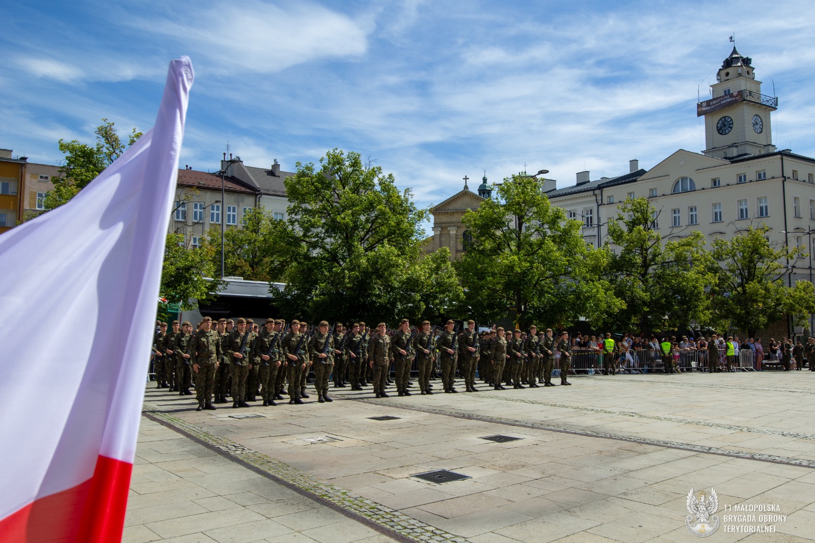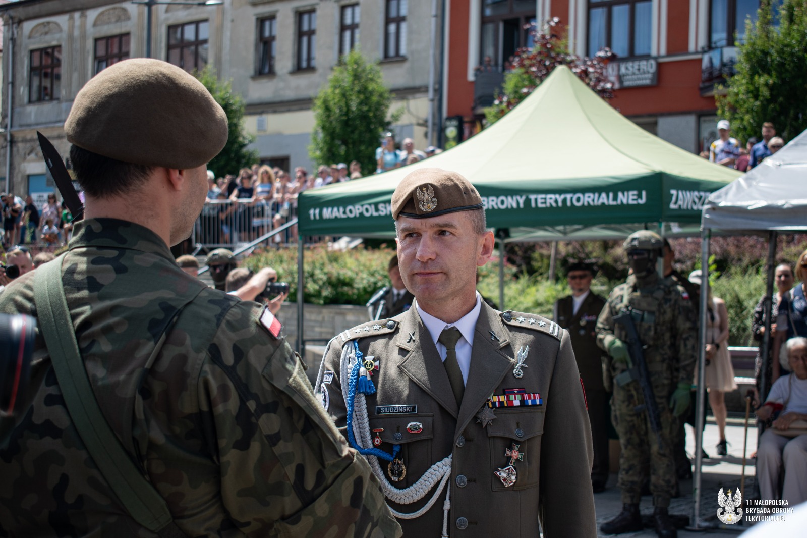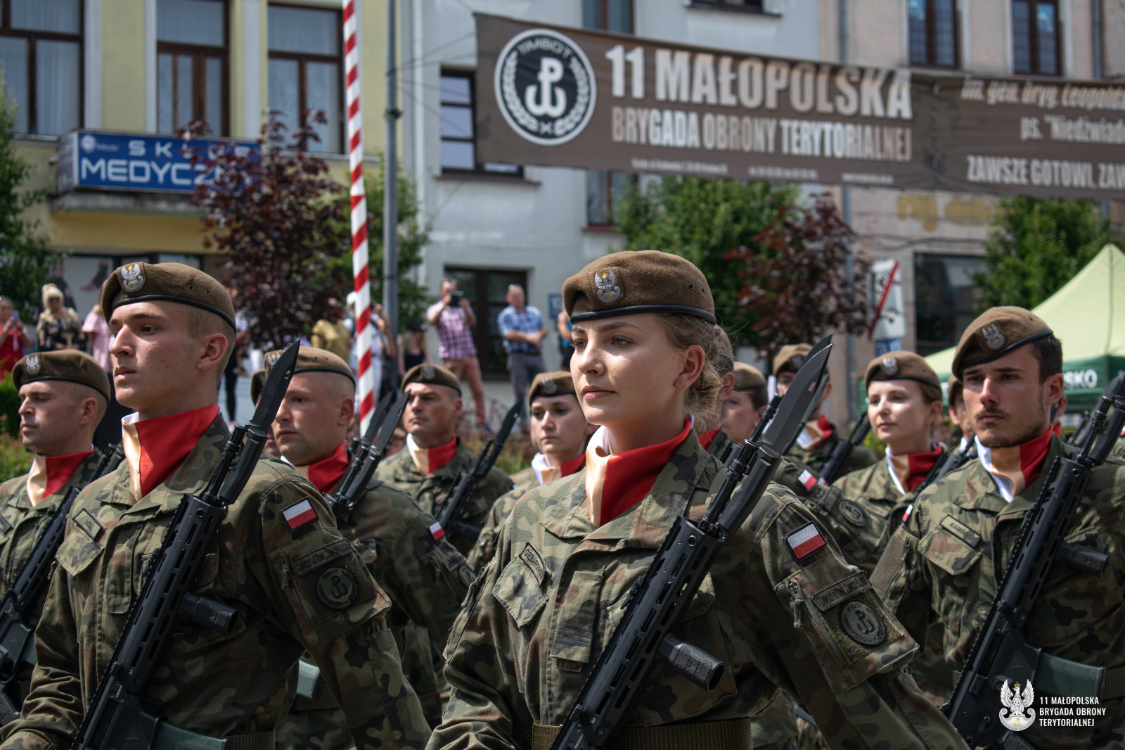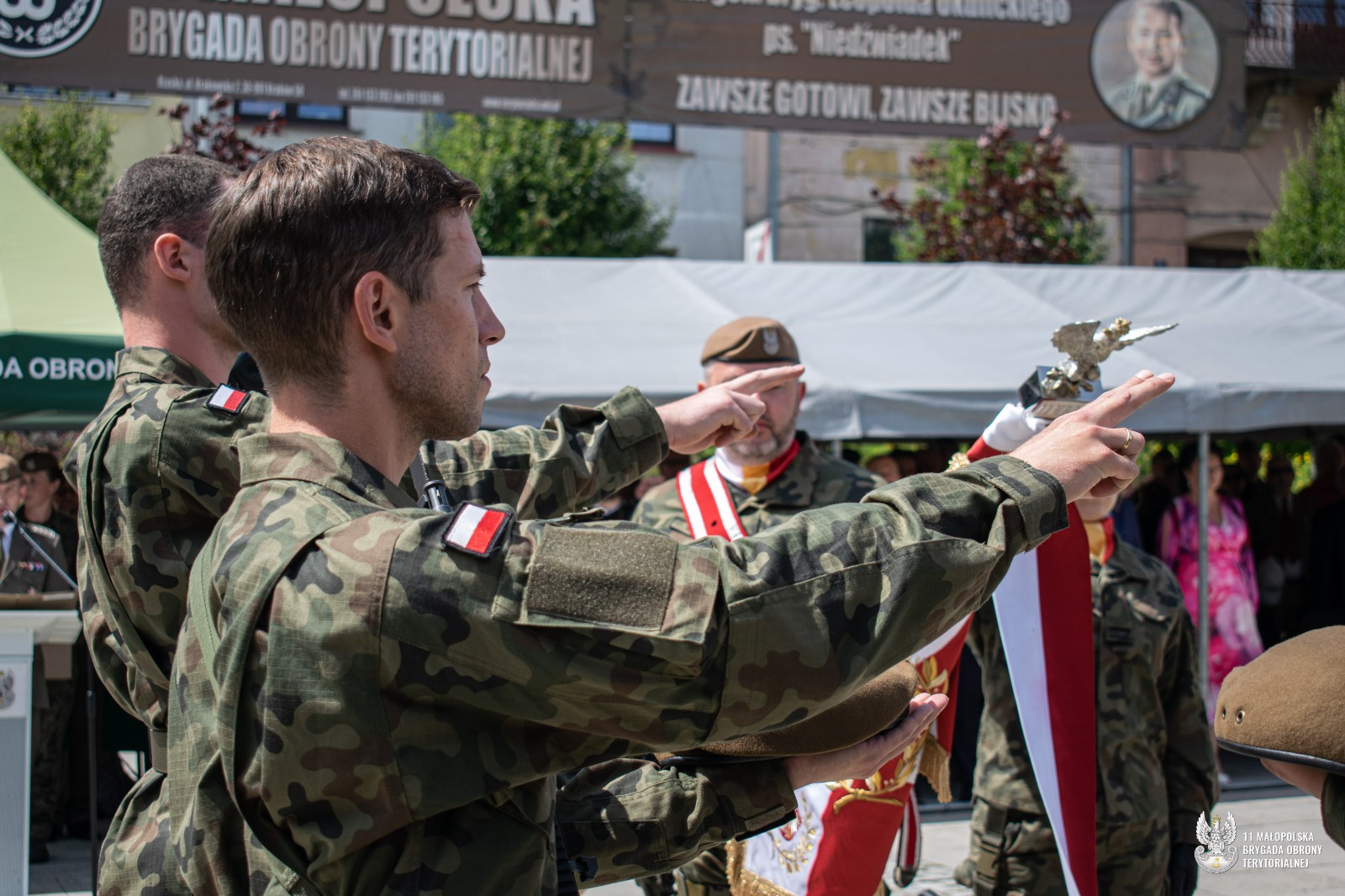 Uroczyste ślubowanie Terytorialsi złożyli w obecności dowódcy jednostki, płka Marcina Siudzińskiego. – Jesteśmy w różnym wieku, mamy różne historie i rozmaite pasje. Na co dzień wykonujemy różne zawody, ale łączy nas jedno – wiara w te same wartości. Jeśli chcemy żyć w bezpiecznym kraju, sami musimy o to bezpieczeństwo zadbać. Najprościej właśnie zakładając mundur – mówił do żołnierzy podczas przysięgi dowódca 11 Małopolskiej Brygady Obrony Terytorialnej. Gościem honorowym uroczystości w Gorlicach była major Hanna Zawistowska – Nowińska ps. Hanna Zerwicz, żołnierz Armii Krajowej, uczestniczka Powstania Warszawskiego. Zasłużona sanitariuszka z wdzięcznością przyjęła odznakę pamiątkową 11 Małopolskiej Brygady. Zaprzysiężonym żołnierzom towarzyszyła kompania honorowa 113 batalionu lekkiej piechoty małopolskich terytorialsów. Po uroczystej defiladzie  na uczestników czekał pokaz sprzętu wojskowego. Można było również spróbować tradycyjnej żołnierskiej grochówki. Żołnierze oraz uczestnicy uroczystości mieli niepowtarzalna okazję aby podzielić się tym co najcenniejsze, oddać krew w przygotowanym specjalnie na ten cel krwiobusie. Chętnych nie brakowało.