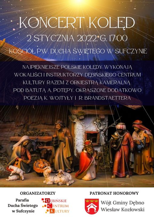 Będzie można usłyszeć najpiękniejsze polskie kolędy w klasycznych i nowych aranżacjach. Wykonają je wokaliści, instruktorzy Dębińskiego Centrum Kultury razem z orkiestrą kameralną, złożoną z nauczycieli szkół muzycznych, studentów Akademii Muzycznej, muzyków DCK, pod batutą Artura Potępy, który jest także autorem muzycznych aranżacji. Wystąpią dobrze znani już z wcześniejszych koncertów wokaliści: Sylwia Wiktoria Pasek, Zuzanna Kuliszewska, Natalia Sumara, Kamila Roczniak, Tatiana Szczupak, Wiktoria Płaneta, Damian Zgraja.