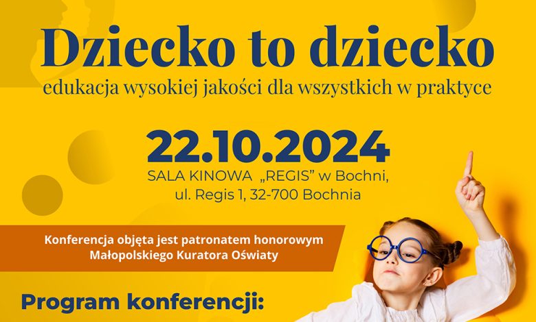 Poradnia Psychologiczno-Pedagogiczna w Bochni oraz Starostwo Powiatowe w Bochni zapraszają na konferencję pt. „Dziecko to dziecko – edukacja wysokiej jakości dla wszystkich w praktyce”, która odbędzie się 22 października 2024 r. w Kinie Regis w Bochni. Wydarzenie skierowane jest do rodziców, nauczycieli i specjalistów, a jego tematem będzie edukacja włączająca oraz wsparcie dzieci z zaburzeniami psychicznymi. Udział w konferencji jest bezpłatny, a zgłoszenia przyjmowane są online.