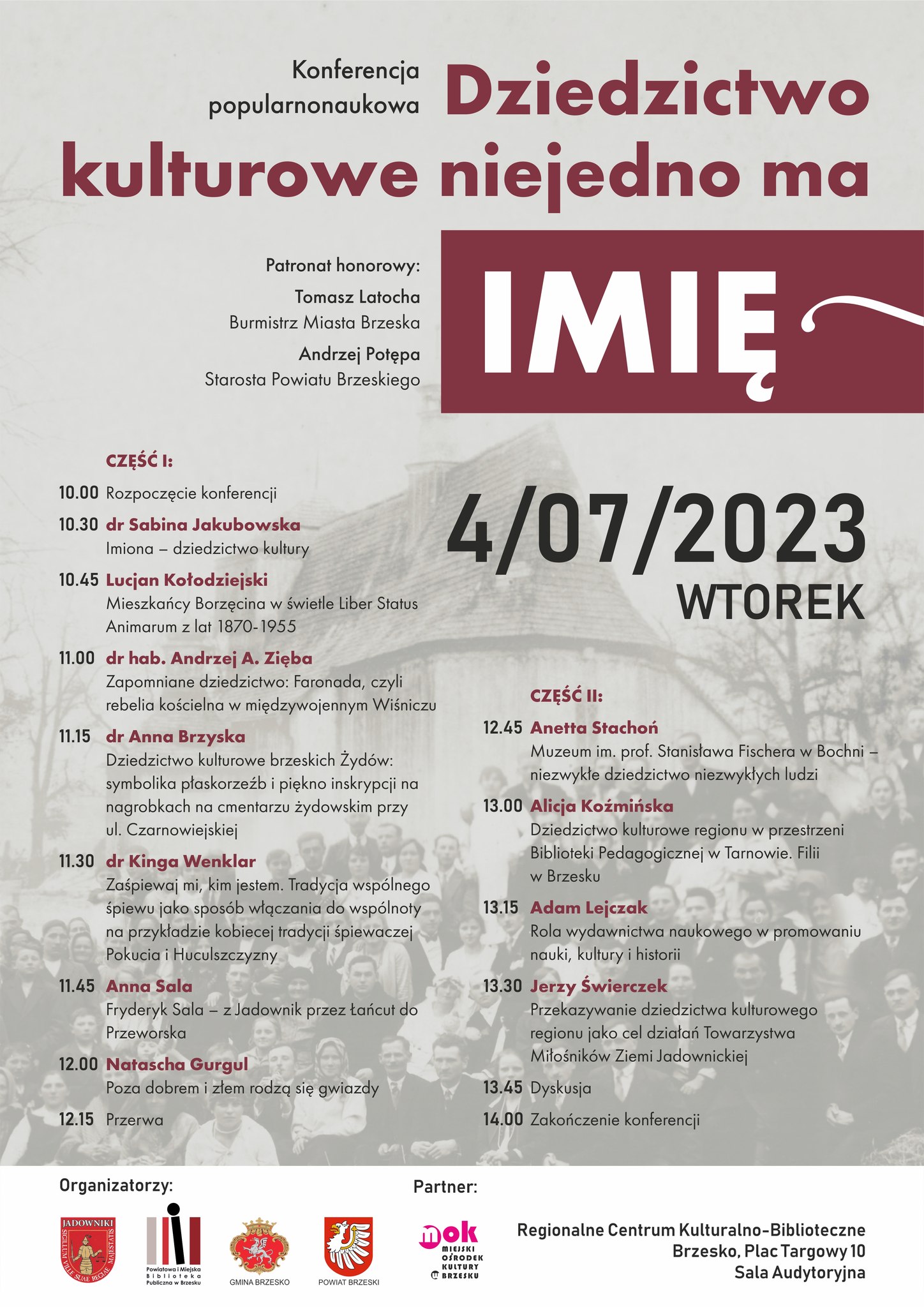 Powiatowa i Miejska Biblioteka Publiczna w Brzesku, Towarzystwo Miłośników Ziemi Jadownickiej, Urząd Miejski w Brzesku i Starosto Powiatowe w Brzesku zapraszają na konferencję popularnonaukową „Dziedzictwo kulturowe niejedno ma imię”. Konferencja odbędzie się we wtorek 4 lipca 2023 r. w Regionalnym Centrum Kulturalno Bibliotecznym w Brzesku. Rozpoczęcie o godz. 10.00.