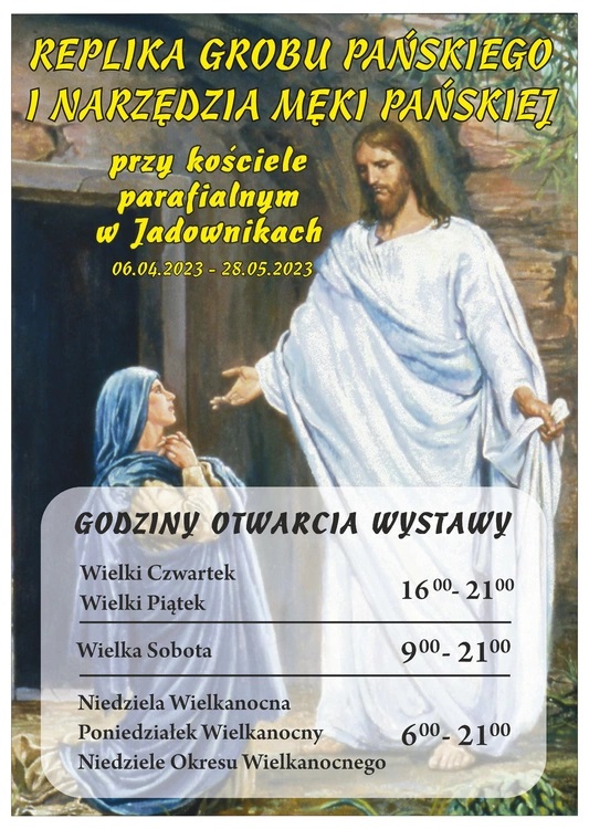 Wystawa dostępna jest dla zwiedzających w Triduum Paschalne, Wielkanoc, Poniedziałek Wielkanocny oraz w okresie wielkanocnym w każdą niedzielę od godz. 7.30 do 21.00. Istnieje możliwość umówienia się z opiekunem wystawy na oprowadzenie i omówienie jej zawartości po uprzedniej prośbie wystosowanej na adres e-mail na stronie internetowej parafii św. Prokopa http://parafiajadowniki.com/replika-grobu-panskiego.html <==. Zwiedzanie zarówno indywidualne jak i z przewodnikiem jest bezpłatne. Serdecznie zapraszamy! Wystawa czynna jest niemal do końca maja.