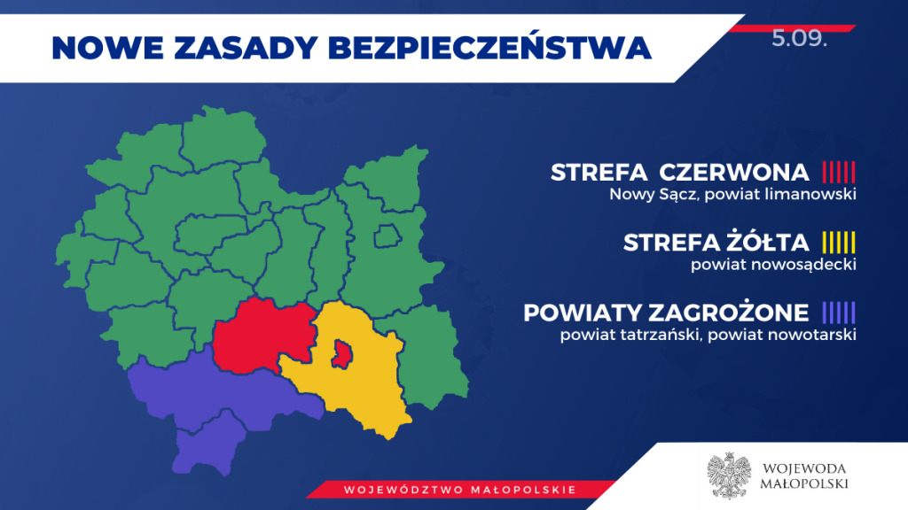 Aktualnie w Małopolsce do strefy czerwonej zaliczono powiat limanowski i miasto Nowy Sącz. W strefie żółtej znalazł się natomiast powiat nowosądecki. Na ostrzegawczej liście powiatów zagrożonych dodatkowymi obostrzeniami jest powiat tatrzański i powiat nowotarski. W wymienionych powiatach obowiązują obostrzenia dotyczące: targów i kongresów, wydarzeń sportowych i kulturalnych, gastronomii, sanatoriów, wesel, transportu i obowiązku noszenia maseczek. Przygotowana przez Ministerstwo Zdrowia lista powiatów, w których obowiązują obostrzenia, powstała na podstawie analiz dynamiki wzrostów zakażeń w ciągu ostatnich 14 dni. Jeśli nowych zachorowań było powyżej 12 na 10 tys. mieszkańców, wtedy powiat zaliczany jest do czerwonej strefy, a jeśli między 6 a 12 na 10 tys., to do żółtej strefy.