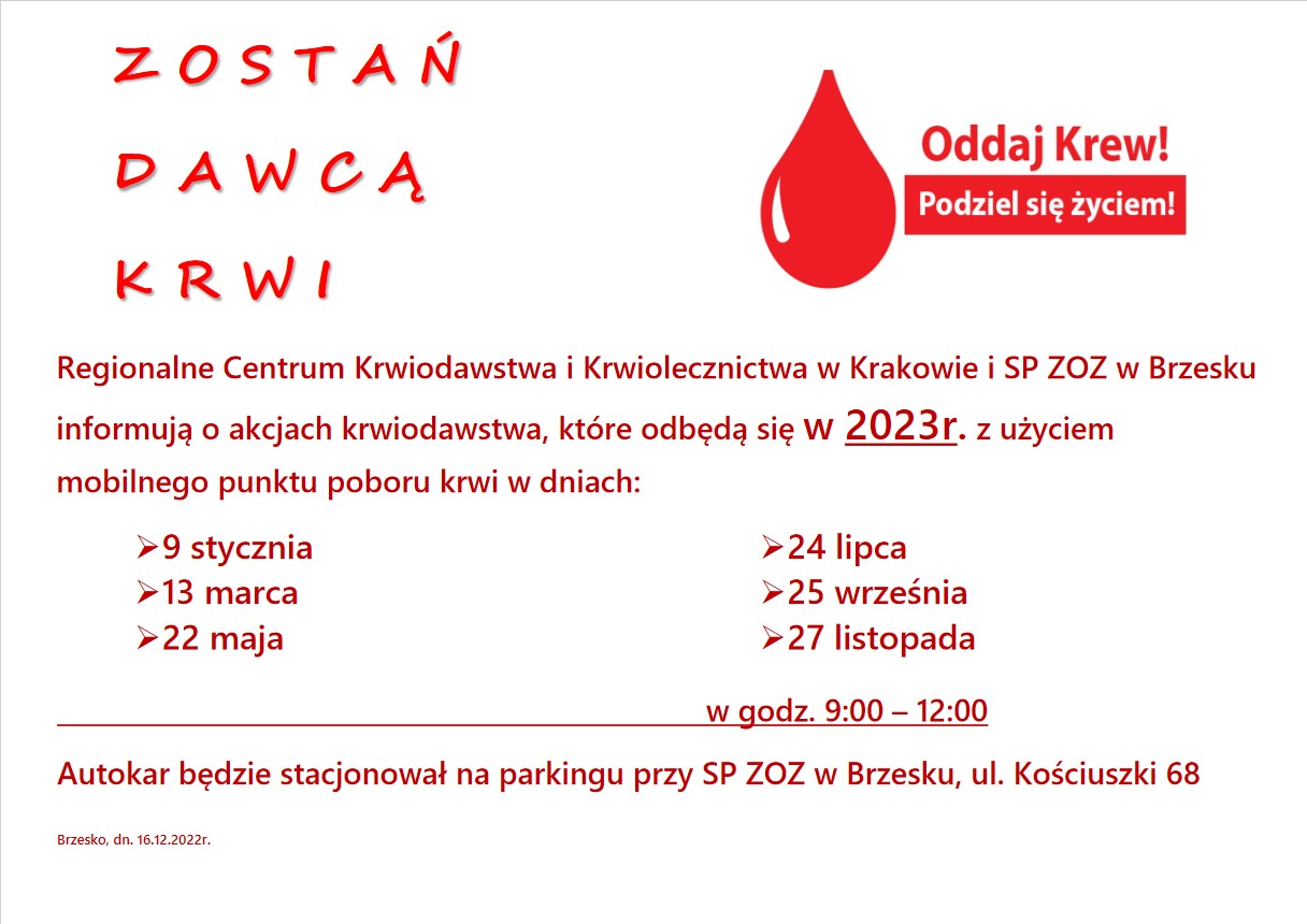 Regionalne Centrum Krwiodawstwa i Krwiolecznictwa w Krakowie i SP ZOZ w Brzesku informują o akcjach krwiodawstwa, które odbędą się w 2023r. z użyciem mobilnego punktu poboru krwi.