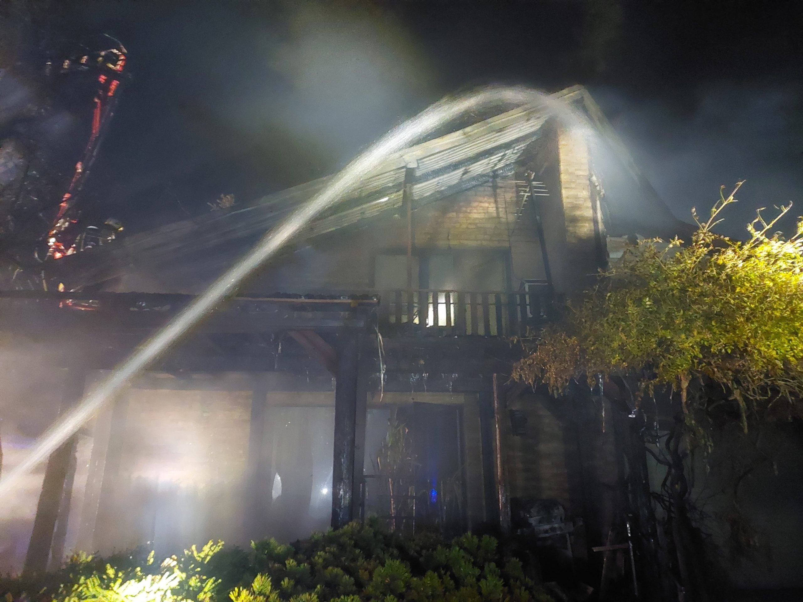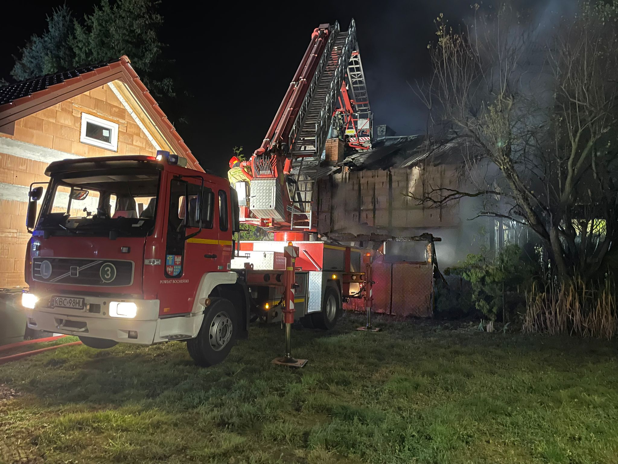 Otrzymano również informację, że przed przybyciem zastępów JOP budynek opuściły trzy osoby w tym dwójka dzieci, które nie zgłaszają żadnych dolegliwości i nie potrzebują pomocy medycznej. Odłączono zasilanie budynku w energię elektryczną, gazową oraz fotowoltaiczną. Dalsze działania polegały na podaniu prądu z podnośnika SHD 24, usuwaniu pokrycia dachowego oraz sukcesywnym przelewaniu konstrukcji dachu. Budynek wyposażony był w instalację fotowoltaiczną, która uległa całkowitemu spaleniu.