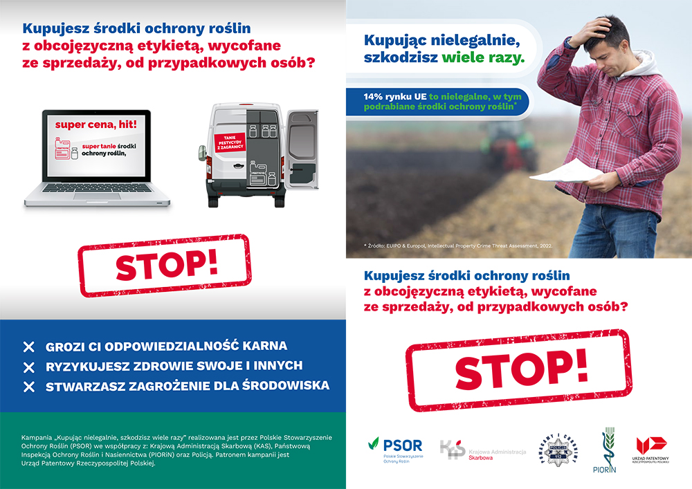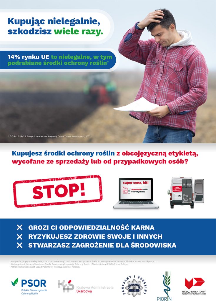 Właśnie dlatego ruszyła 8. edycja ogólnopolskiej kampanii edukacyjnej „Kupując nielegalnie, szkodzisz wiele razy”. Jej celem jest zmniejszenie ilości zakupu i stosowania nielegalnych, w tym podrobionych środków ochrony roślin oraz podnoszenie świadomości rolników na temat ryzyk zdrowotnych, środowiskowych, prawnych i ekonomicznych wynikających z ich stosowania. Kampanię realizują wspólnie: Polskie Stowarzyszenie Ochrony Roślin (PSOR), Krajowa Administracja Skarbowa (KAS), Państwowa Inspekcja Ochrony Roślin i Nasiennictwa (PIORiN) oraz Policja, pod patronatem Urzędu Patentowego RP.