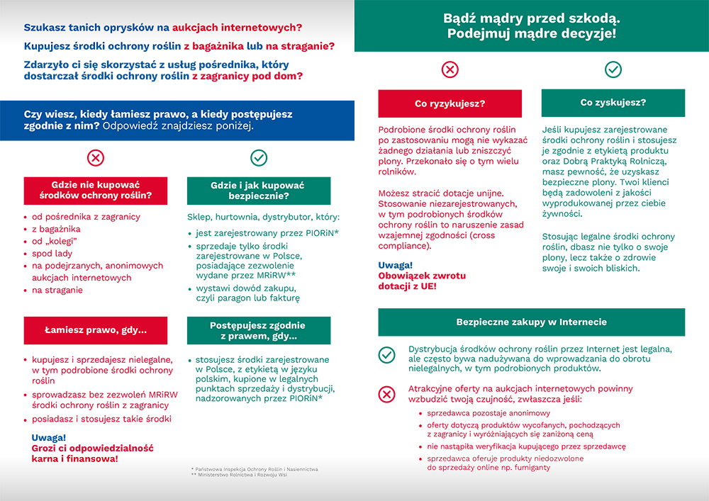 Szczególną ostrożność zaleca się przy ofertach sprzedaży środków ochrony roślin zamieszczanych w internecie, zwłaszcza gdy są anonimowe, a cena jest podejrzanie niska. Należy podkreślić, że choć sprzedaż internetowa środków ochrony roślin jest prawnie dopuszczona, to często nadużywana jest do wprowadzania do obrotu nielegalnych, w tym podrobionych środków ochrony roślin Dlatego kampania zwraca również uwagę na zmiany przepisów ustawy z dnia 8 marca 2013 r. o środkach ochrony roślin mające ograniczać ryzyka w sprzedaży online, w tym wprowadzenie całkowitego zakazu sprzedaży fumigantów przez internet oraz podawanie danych identyfikujących sprzedawcę oraz osoby nabywające pozostałe środki ochrony roślin w internecie.