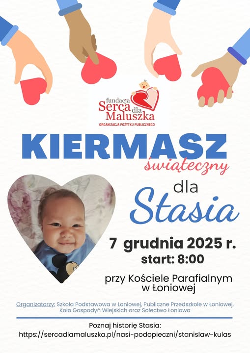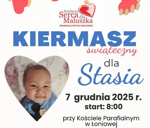 7 grudnia 2025 r. od godziny 8:00 przy Kościele Parafialnym w Łoniowej odbędzie się Świąteczny Kiermasz dla Stasia Kulasa.