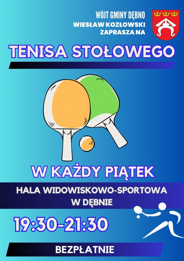 Wójt Gminy Dębno Wiesław Kozłowski serdecznie zaprasza wszystkich mieszkańców do skorzystania z możliwości gry w tenisa stołowego na Hali Widowiskowo-Sportowej w Dębnie.
