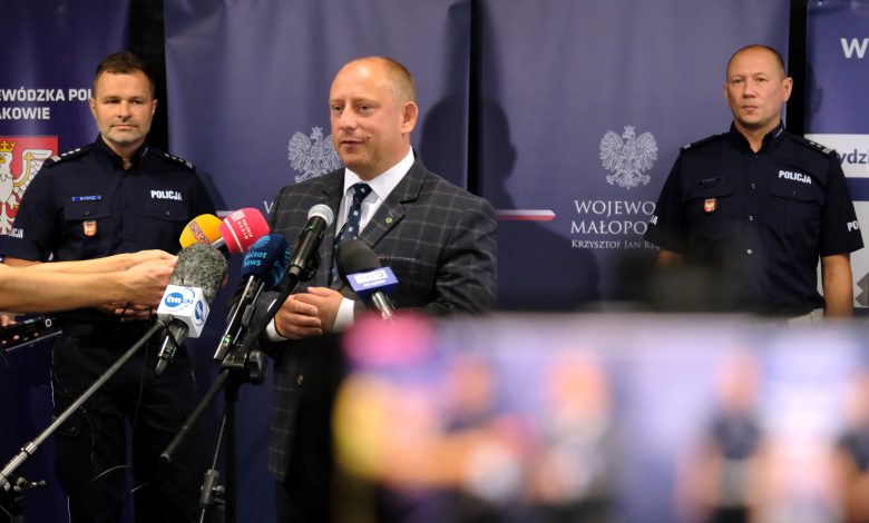 Na briefingu prasowym wojewoda Klęczar wraz z I zastępcą komendanta wojewódzkiego Policji w Krakowie insp. Maciejem Kubiakiem i z naczelnikami Wydziału Ruchu Drogowego i Prewencji Komendy Wojewódzkiej Policji w Krakowie mł. insp. Wojciechem Matrasem i mł. insp. Robertem Michalikiem podsumowali pierwszy miesiąc wakacji z perspektywy Policji.