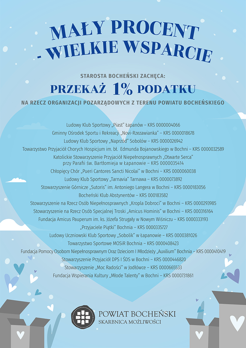 Trwa czas rozliczeń podatkowych, to najlepsza okazja do wsparcia inicjatyw społecznych i przekazania 1% podatku na rzecz organizacji pożytku publicznego. Każdy z nas może przekazać wsparcie organizacji z powiatu bocheńskiego, a tym samym sprawić by trafił tam, gdzie jest najbardziej potrzebny.