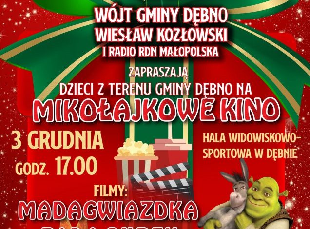 Wójt Gminy Dębno serdecznie zaprasza dzieci z terenu Gminy Dębno do wzięcia udziału w mikołajkowym pokazie filmów animowanych ,,Madagwiazdka’’ i ,,Pada Shrek’’ dnia 3 grudnia o godzinie 17.00 na Hali Widowiskowo-Sportowej w Dębnie .