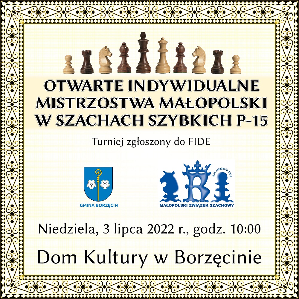 Zapraszamy w niedzielę 3 lipca br. na Otwarte Indywidualne Mistrzostwa Małopolski w Szachach Szybkich P-15. Od godziny 10 w Sali Imprez Domu Kultury w Borzęcinie zawodnicy rywalizować będą w systemie szwajcarskim na dystansie 9 rund.
