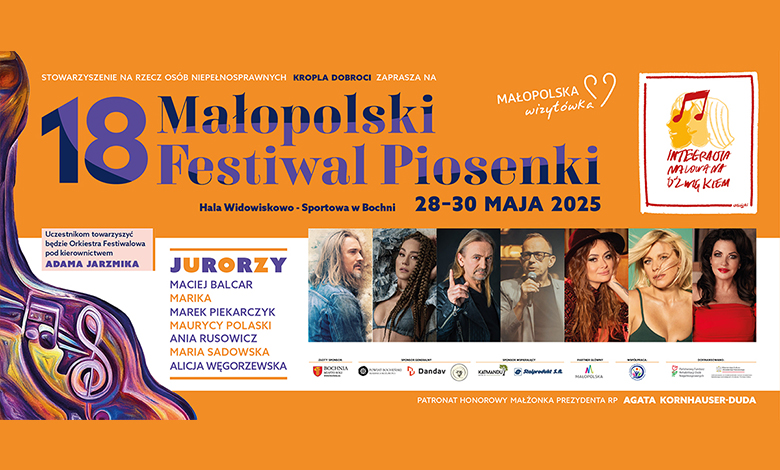 Już 28 maja rusza 18. edycja Małopolskiego Festiwalu Piosenki „Integracja malowana dźwiękiem”. To trzy dni, podczas których Bochnia zamieni się w miejsce pełne dobrej energii, inspirujących spotkań i muzyki łączącej bez względu na bariery. W tym roku uczestników oceniać będzie jury złożone z uznanych artystów: obok wieloletnich przyjaciół festiwalu czyli Alicji Węgorzewskiej, Ani Rusowicz i Maurycego Polaskiego, pojawią się także nowe twarze: Marika, Maria Sadowska oraz Maciej Balcar. Nie zabraknie Marka Piekarczyka, który wspiera Festiwal od samego początku.
