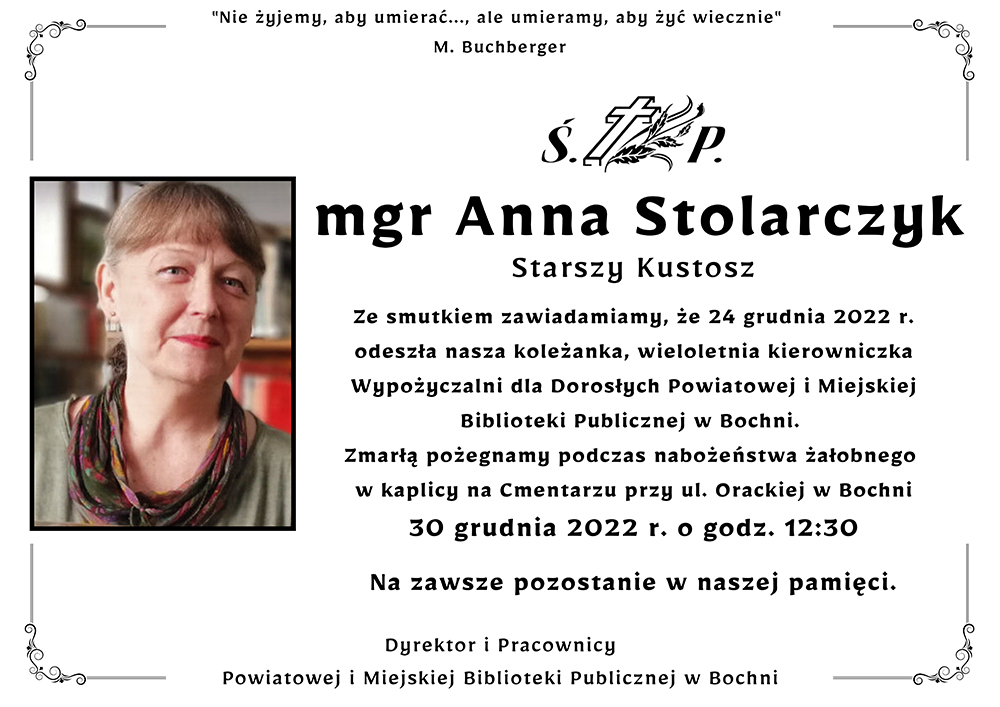 Ze smutkiem informujemy, że 24 grudnia 2022 r. zmarła Anna Stolarczyk – wieloletni pracownik Powiatowej i Miejskiej Biblioteki Publicznej w Bochni.
