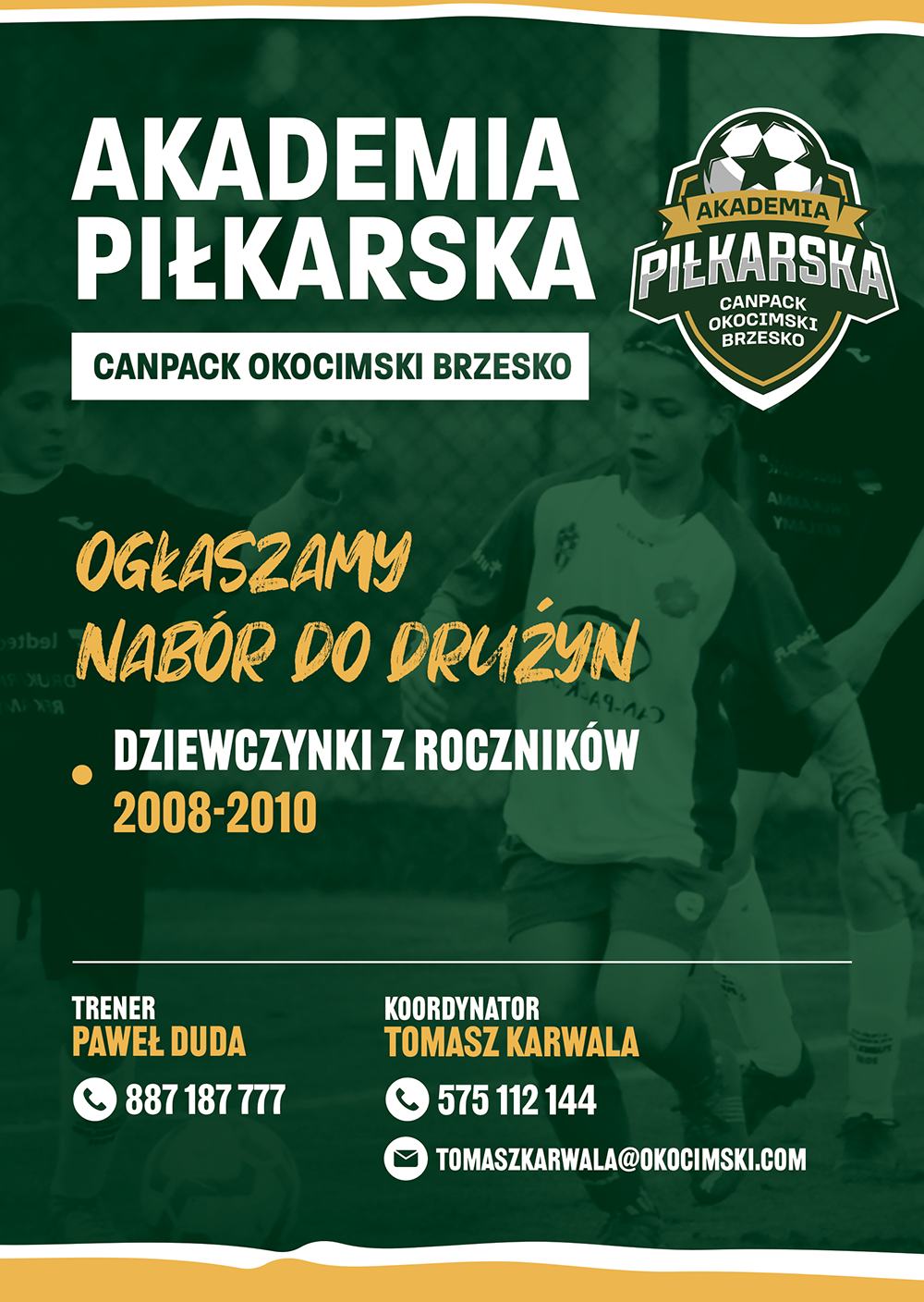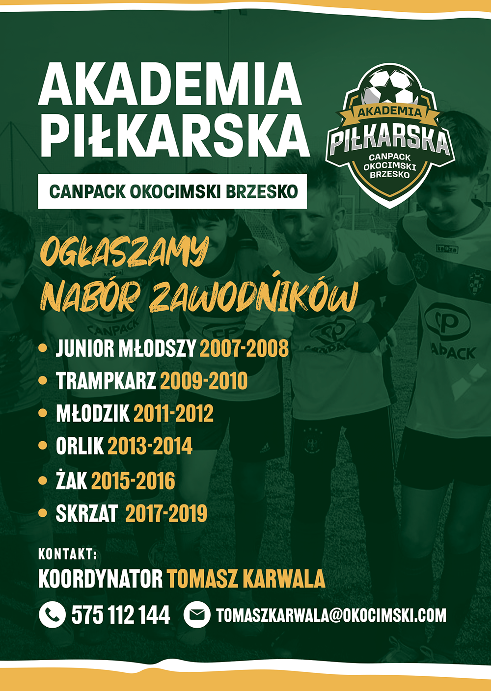 Zarząd Klubu wraz ze sztabem szkoleniowym AP CANPACK Okocimski informuje, że trwa nabór do młodzieżowych grup naszej Akademii Piłkarskiej. Nabór dotyczy juniorów młodszych (2007-2008), trampkarzy (2009-2010), młodziki (2011-2012), orliki (2013-2014), żaki (2015-2016), skrzaty (2017-2019) oraz dziewczynki z rocznika 2008-2010.