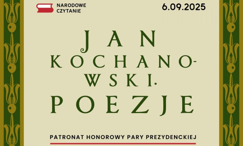 W ramach Narodowego Czytania 2025 zaplanowano wspólne czytanie poezji Jana Kochanowskiego – jednego z najwybitniejszych twórców polskiego i europejskiego renesansu. Finał wydarzenia odbędzie się w sobotę, 6 września 2025 roku.