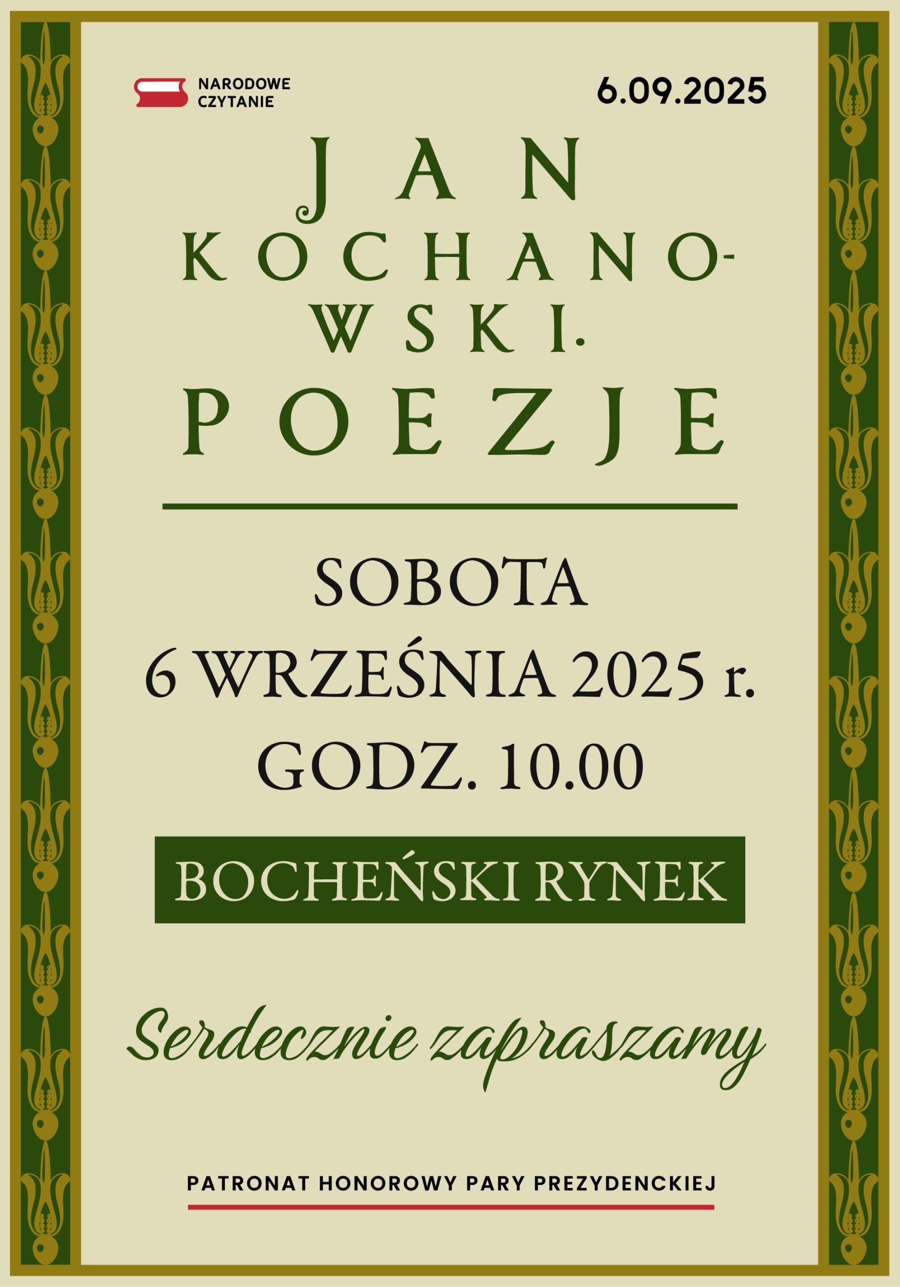 W sobotę, 6 września 2025 r., o godz. 10:00 na bocheńskim rynku odbędzie się czternasta edycja Narodowego Czytania. Tegoroczna odsłona ogólnopolskiej akcji, organizowanej pod honorowym patronatem Pary Prezydenckiej, poświęcona jest poezji Jana Kochanowskiego.