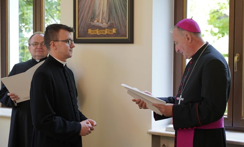 W domu biskupa tarnowskiego 31 maja wyświęconych 28 maja 2022 17 nowych tarnowskich kapłanów otrzymało aplikaty na pierwsze parafie.