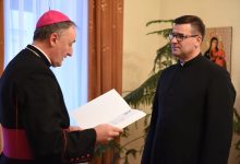W domu biskupa tarnowskiego 31 maja wyświęconych 28 maja 2022 17 nowych tarnowskich kapłanów otrzymało aplikaty na pierwsze parafie.