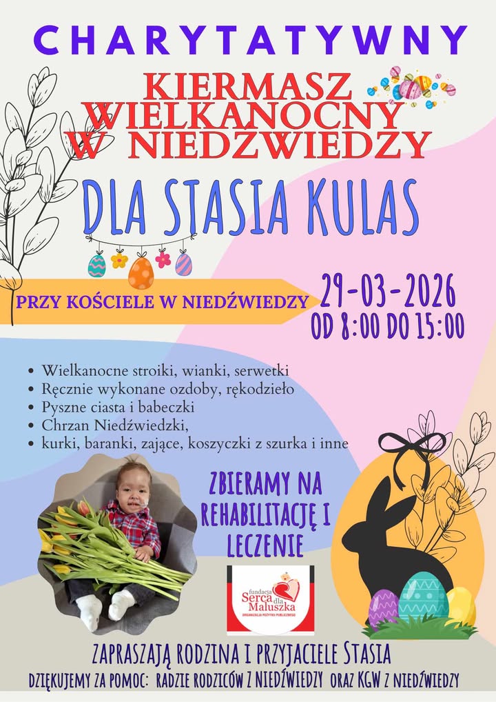 29 marca 2026 r. w Niedzielę Palmową w Niedźwiedzy odbędzie się charytatywny kiermasz wielkanocny. Zebrane środki zostaną przeznaczone na rehabilitację i leczenie Stasia Kulasa z Łoniowej.